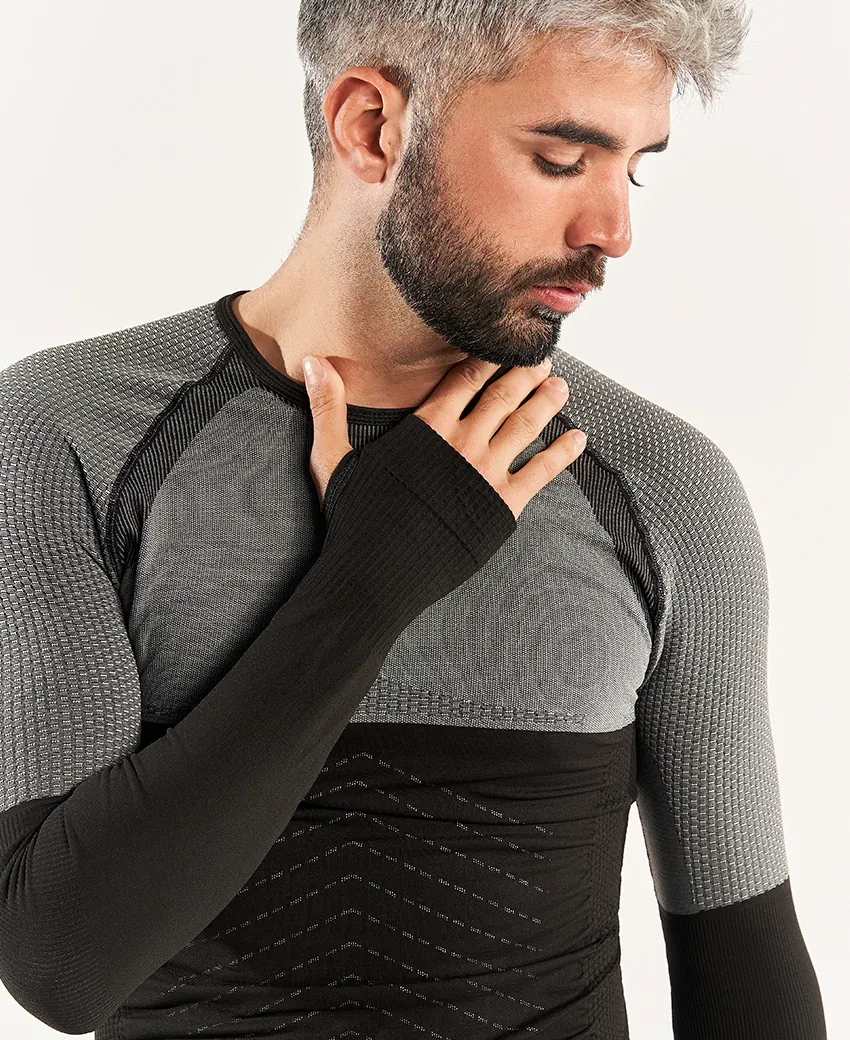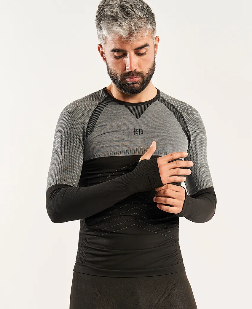 Camiseta técnica de manga larga fabricada con material termorregulador y fibra de carbono. Termorregulación inteligente, rápida absorción del sudor y eliminación de olores.