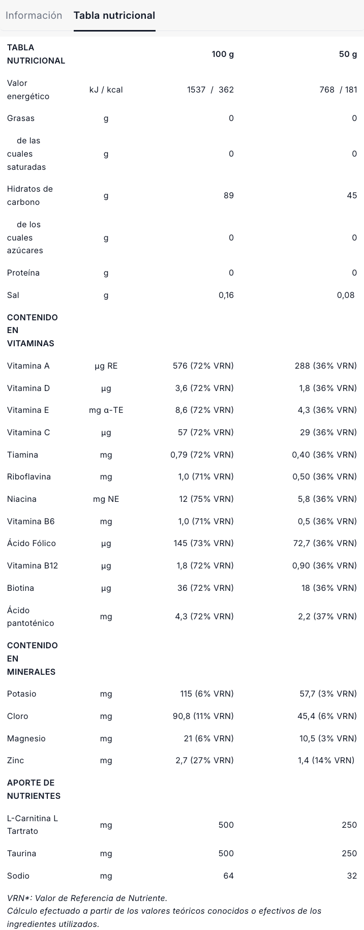 INGREDIENTES: Almidón de patata, aroma, acidulante (ácido cítrico), concentrado de zanahoria negra, L-carnitina L-tartrato, taurina, edulcorante (sucralosa), mezcla de vitaminas (ácido L-ascórbico (Vit C), maltodextrina, acetato de DL-alfa-tocoferilo (Vit E), nicotinamida (niacina), acetato de retinilo (Vit A), D-pantotenato cálcico (ácido pantoténico), colecalciferol (Vit D), clorhidrato de piridoxina (Vit B6), riboflavina (Vit B2), clorhidrato de tiamina (Vit B1), ácido pteroilmonoglutámico (ácido fólico), D-biotina (biotina), cianocobalamina (Vit B12)), citrato de potasio, cloruro de sodio, carbonato de magnesio y gluconato de zinc.