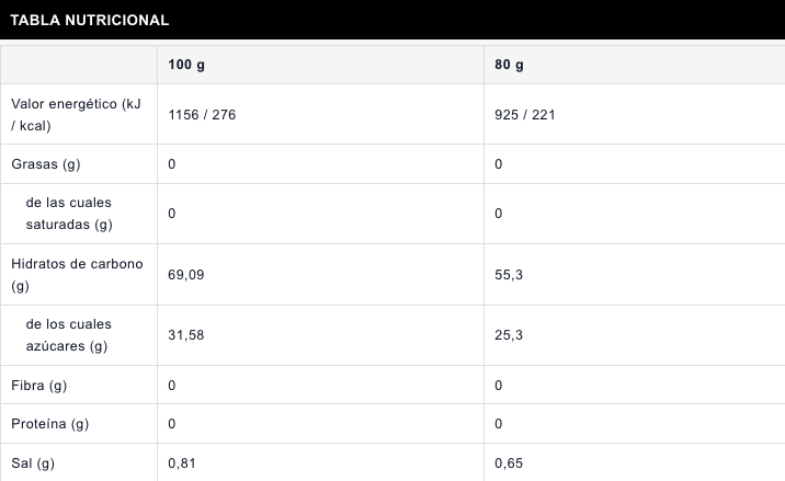 Sin gluten. Gel a base de Hidratos de  carbono (55g), maltodextrina y fructosa. No recomendado para niños ni mujeres embarazadas. Contiene cafeína (100/80g).