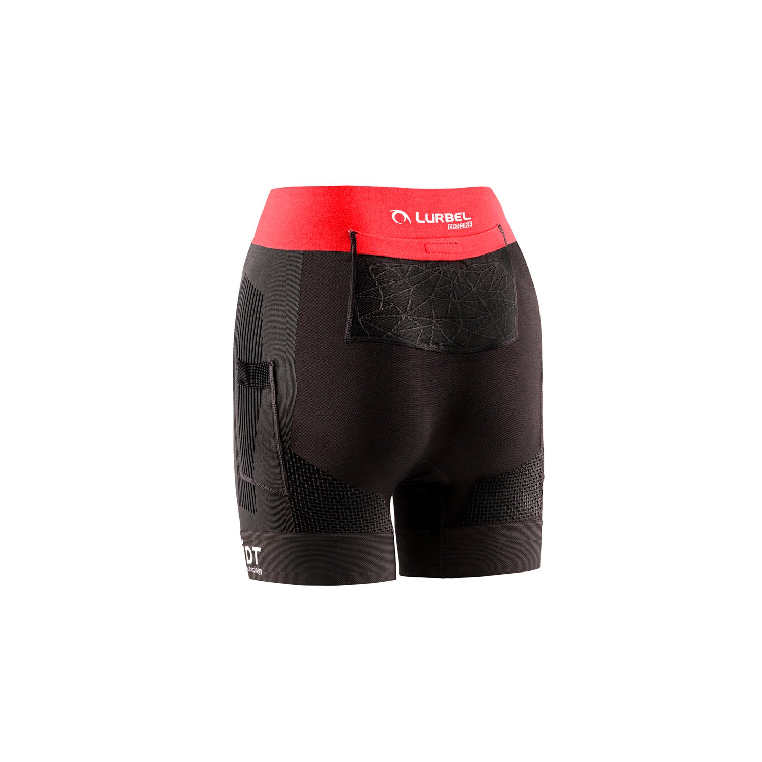 Cuenta con 3 bolsillos distribuidos de la siguiente forma: dos pequeños en el lateral del cuadríceps para poder acceder rápidamente a lo geles o barritas energéticas, y uno más grande en la zona lumbar, para el teléfono, llaves, u otros accesorios con cierre con velcro. Tejido 3D en diversas zonas para liberar presiones y mejorar la ventilación/transpiración.