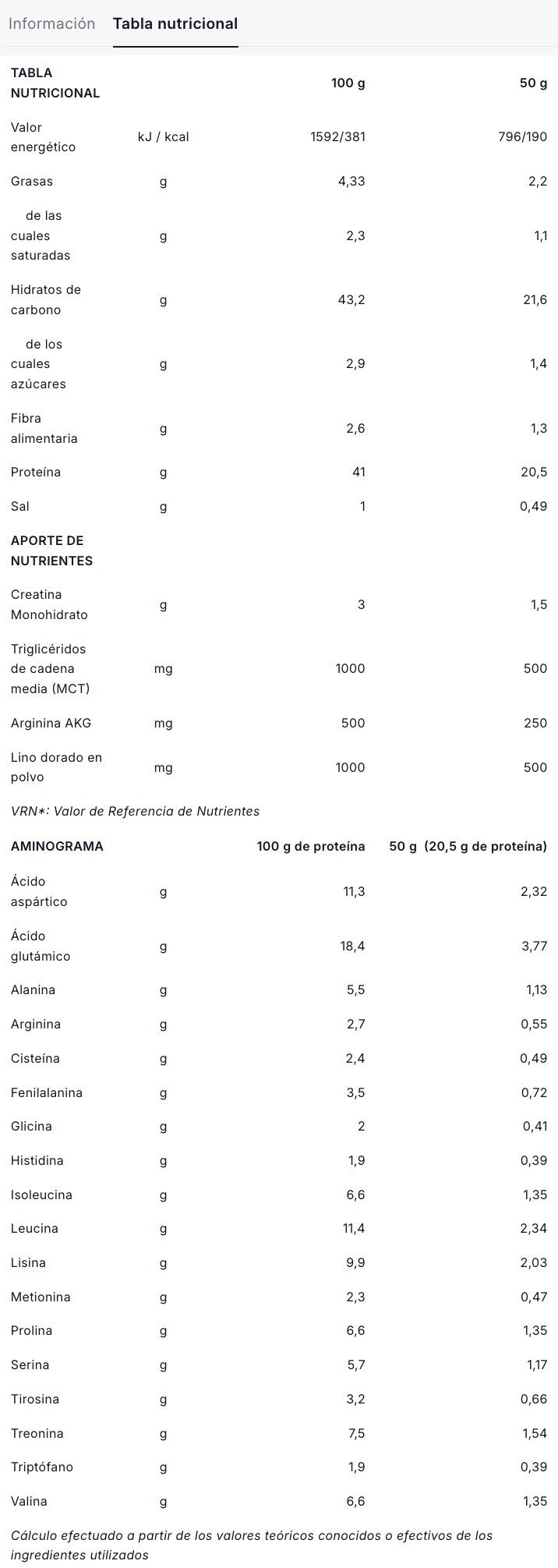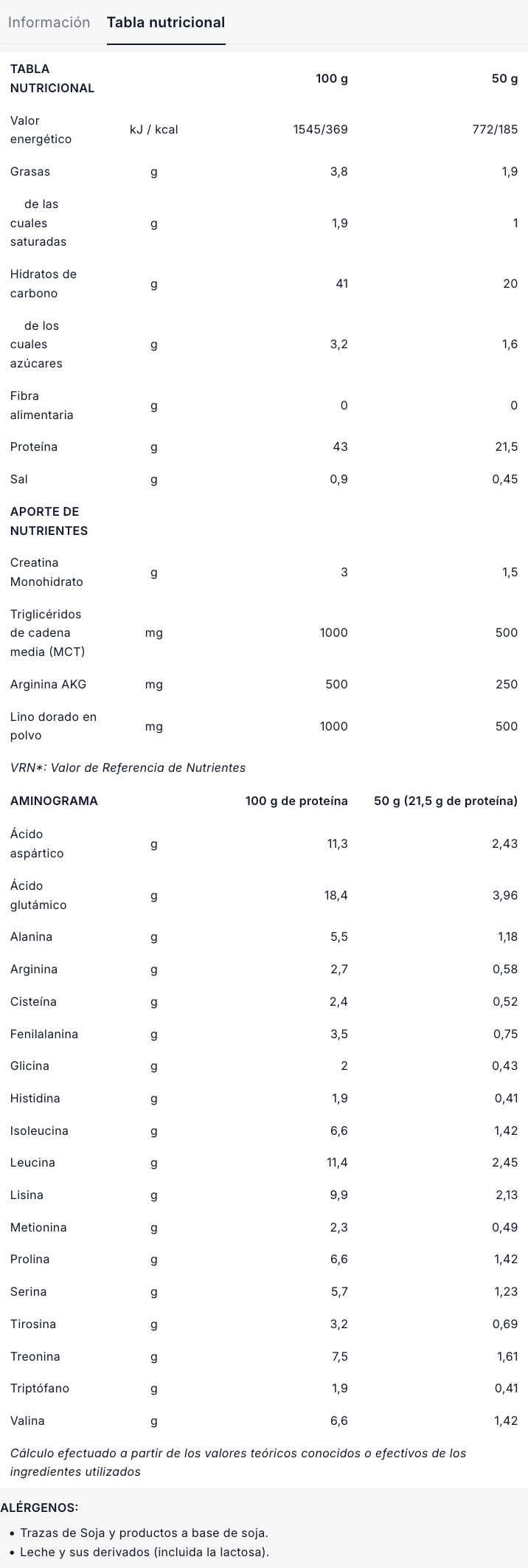 Complemento alimenticio en polvo a base de proteína, hidratos de carbono, creatina, planta, triglicéridos de cadena media y L-arginina. Con edulcorante.