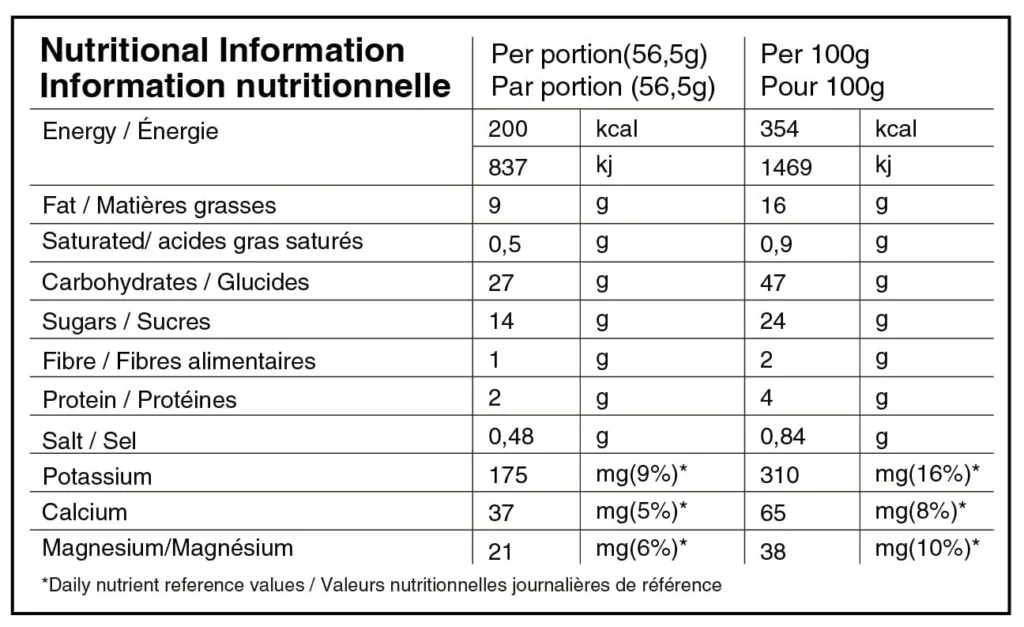 Ingredientes: Jarabe de arce (37%), maltodextrina (21%), agua, semillas de girasol, aceite de girasol, proteína de guisante (2%), sal marina (0,8%), extracto seco de grano de café verde (coffea arabica L)(45% ácido clorogénico, 3% cafeína) (0,5%), cacao en polvo desgrasado (0,5%), extracto del fruto del guaraná (Paullinia cupana) (12% cafeína)(0,4%), cloruro potásico, aroma, conservantes (sorbato potásico, tocoferoles mixtos).